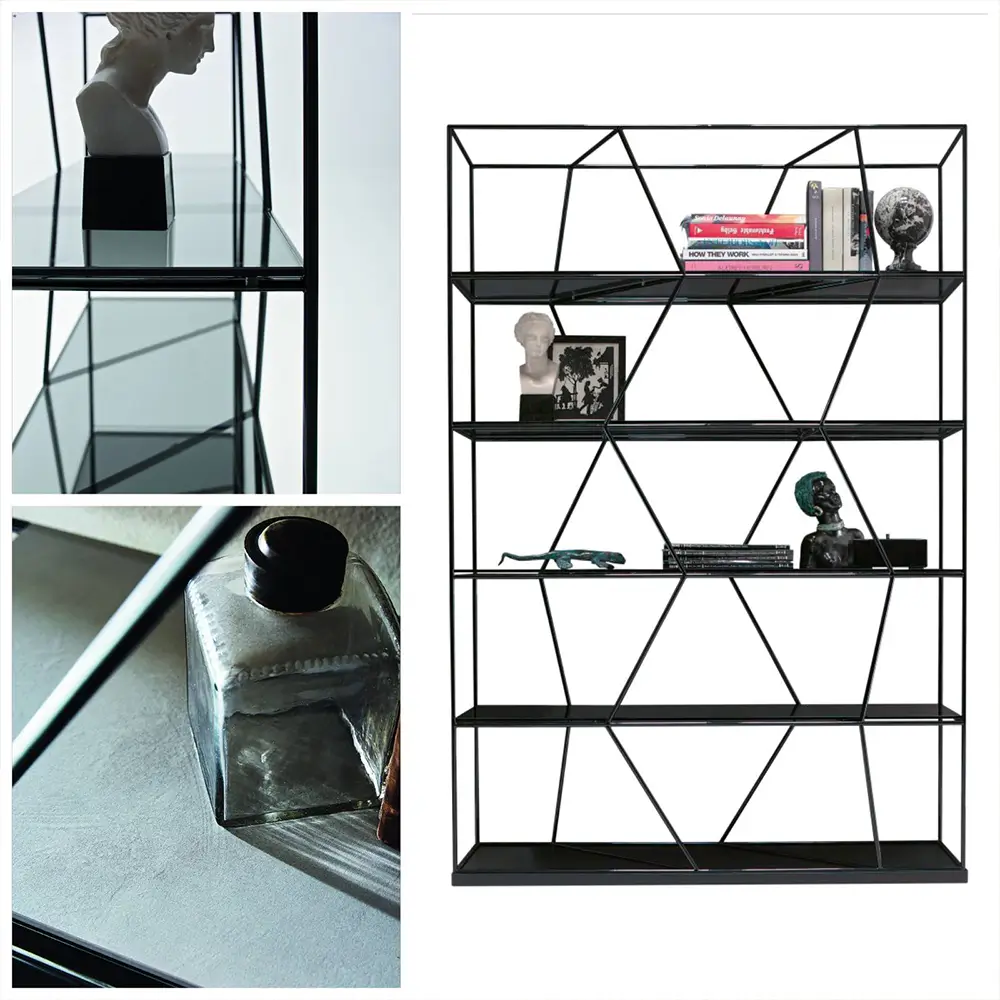 Structure en métal laqué (plusieurs coloris). Choisissez la matière des étagères parmi : le métal, la céramique, le métal gainé cuir de couleurs. Mais aussi parmi le bois plaqué chêne, noyer, orme, ou le verre transparent ou fumé gris. Autres dimensions possibles : L 225, 325 cm.
