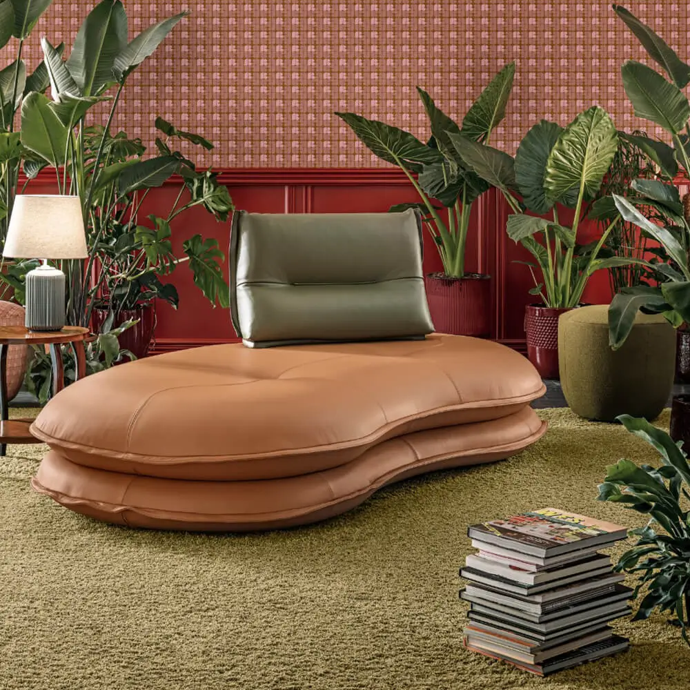 Structure portante bois massif et métal. Rembourrage assise en mousse polyuréthane 35kg/m3. Suspension sur sangles élastiques entrecroisées. Choix du système de dossier : mécanisme manuel d’avance – recule ou système des dossiers amovibles. Les modules ont une largeur qui varie : 208, 188, 168 ou 101 cm. Existe aussi en méridienne droite ou courbe, en pouf & banquette. Le prix indiqué concerne la méridienne courbe et un dossier moyen, recouvert d’un tissu cat B.