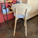 Structure chêne massif. Repose pied & entretoise en métal noir. Assise en mousse ép.4cm densité HR50, dossier avant mousse 3cm dens.30kg, dossier arrière mousse 1cm dens.30kg. Thalès n’existe qu’en hauteur snack : hauteur d’assise 67 cm (pas hauteur de bar). Trois versions de dos possibles : tapissé, avec une poignée en chêne, dos recouvert de multiplis de chêne. Tissus à choisir parmi 70 références.