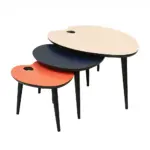 Quoi de plus naturel pour ses tables évoquant les palettes de peintre, que d’être de couleurs ! Réalisées en MDF laqué, laque brossée ou sablée (résistant aux rayures), pieds laqués couleurs au choix. Existe en dessus merisier ou chêne