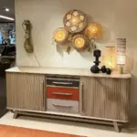 Chêne massif et panneaux de particules haute densité revêtus d’un placage de chêne. 3 portes dont 2 coulissantes à rideaux en chêne massif, 1 battante centrale, 1 tiroir, 1 tirette. Teinte et laque de couleur à personnaliser.