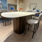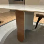 Plateau fixe présenté ici en format rectangulaire aux angles arrondis en céramique de 6 mm ou 12 mm mate ou brillante. Pieds courbés en placage bois ou en option laque de couleurs. Existe en format rond, tonneau, rectangulaire ou carré aux angles droits ou arrondis, ovale, galet. Existe aussi en hauteur snack 92 cm