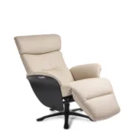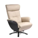 Base pivotante avec mémorisation de la position initiale. Relax électrique 1 moteur, repose-pieds intégré. Structure en aluminium et extérieur placage de chêne teinte noire. Rembourrage assise en mousse polyuréthane moulée à froid densité 55kg/m3. Pieds étoile en aluminium noir. Option possible : batterie rechargeable. Présenté ici coque extérieure en bois chêne teinté ou noyer, ou recouverte de tissu ou cuir. Hauteur d’assise 47 cm, profondeur quand totalement déployé 152 cm.